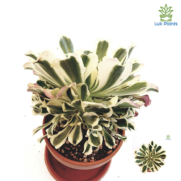 Această suculentă decorativă cu frunze variegate aduce un plus de culoare și eleganță oricărui spațiu. Este ușor de întreținut, rezistentă și perfectă pentru aranjamente moderne cu plante suculente.